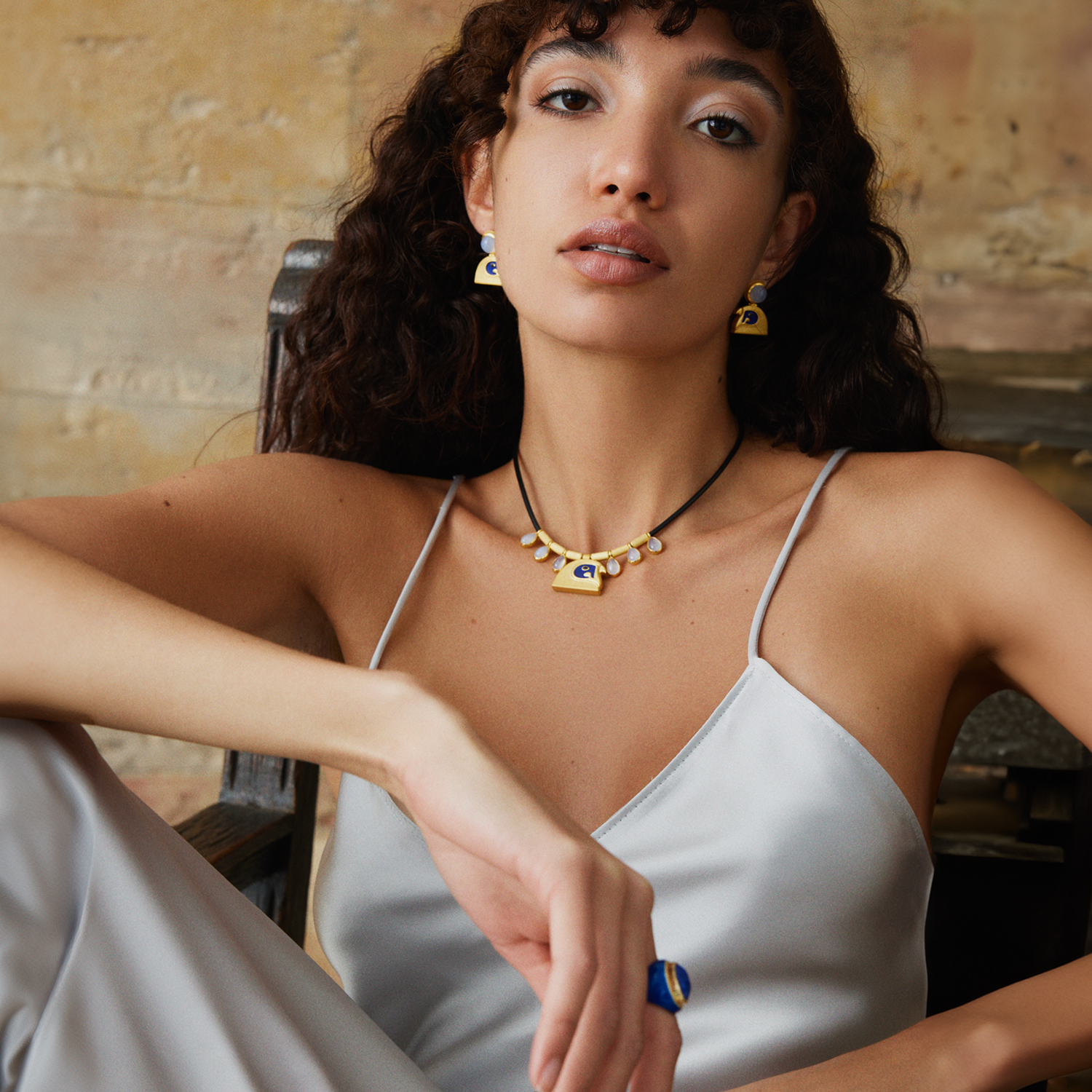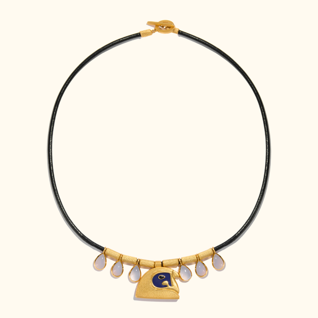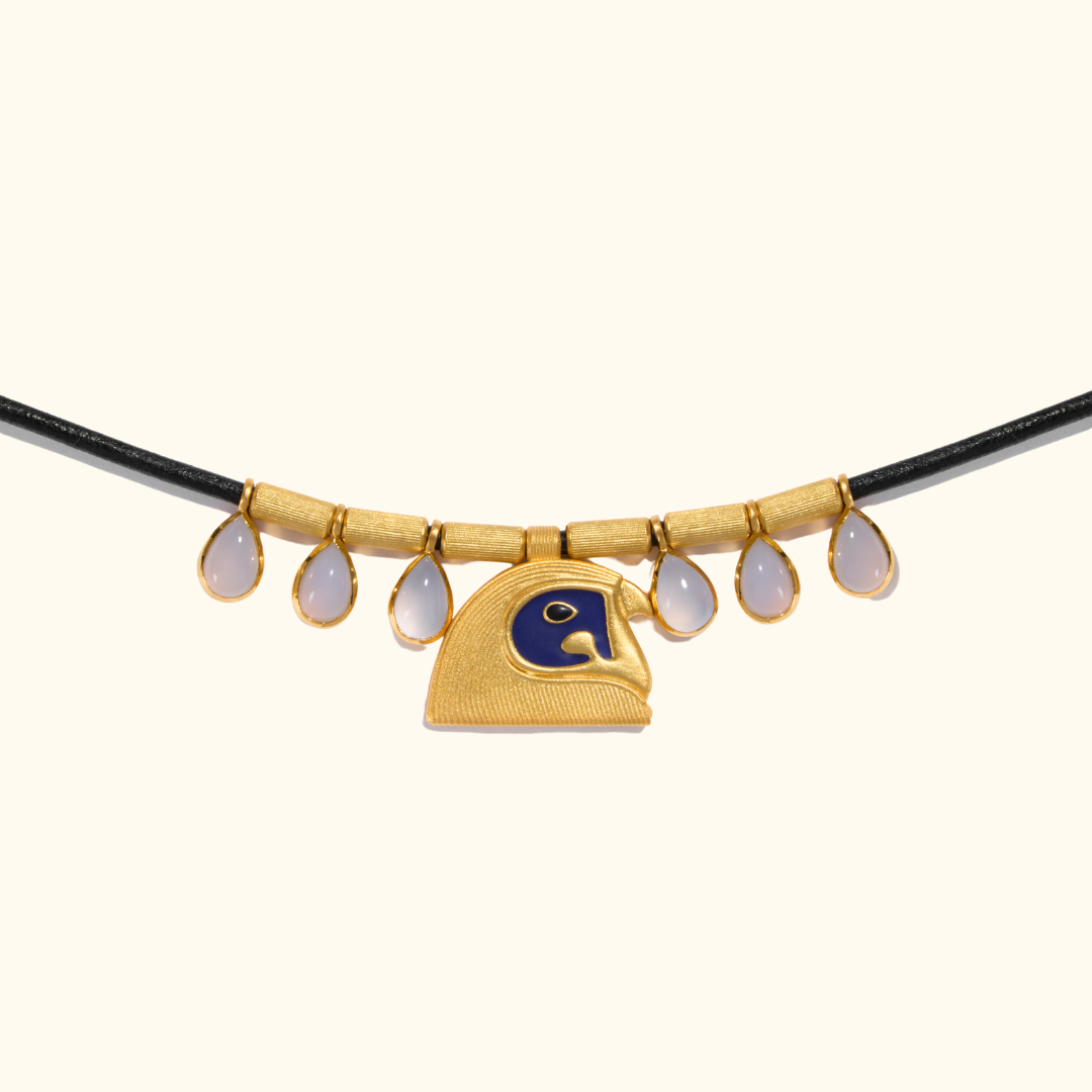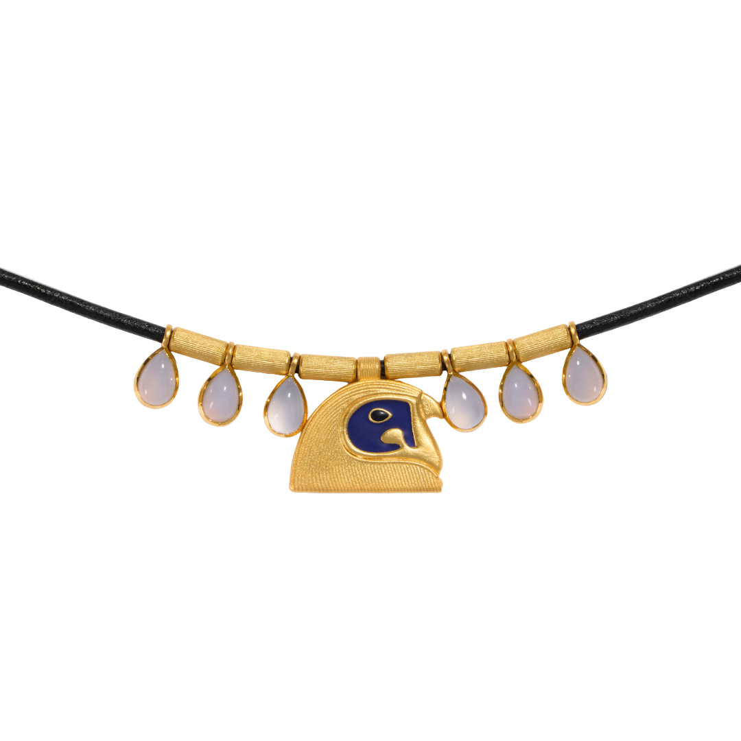 In ancient Egypt, the Eye of Horus held profound symbolism, representing protection, health, and restoration. This design captures the essence of the falcon-headed deity, featuring the eye encased in vibrant blue enamel, evoking the boundless expanse of the sky. Surrounding it are delicate tear-drop chalcedonies, reminiscent of the iconic parts of the broad collar necklace, infusing the piece with an aura of timeless elegance and divine significance.