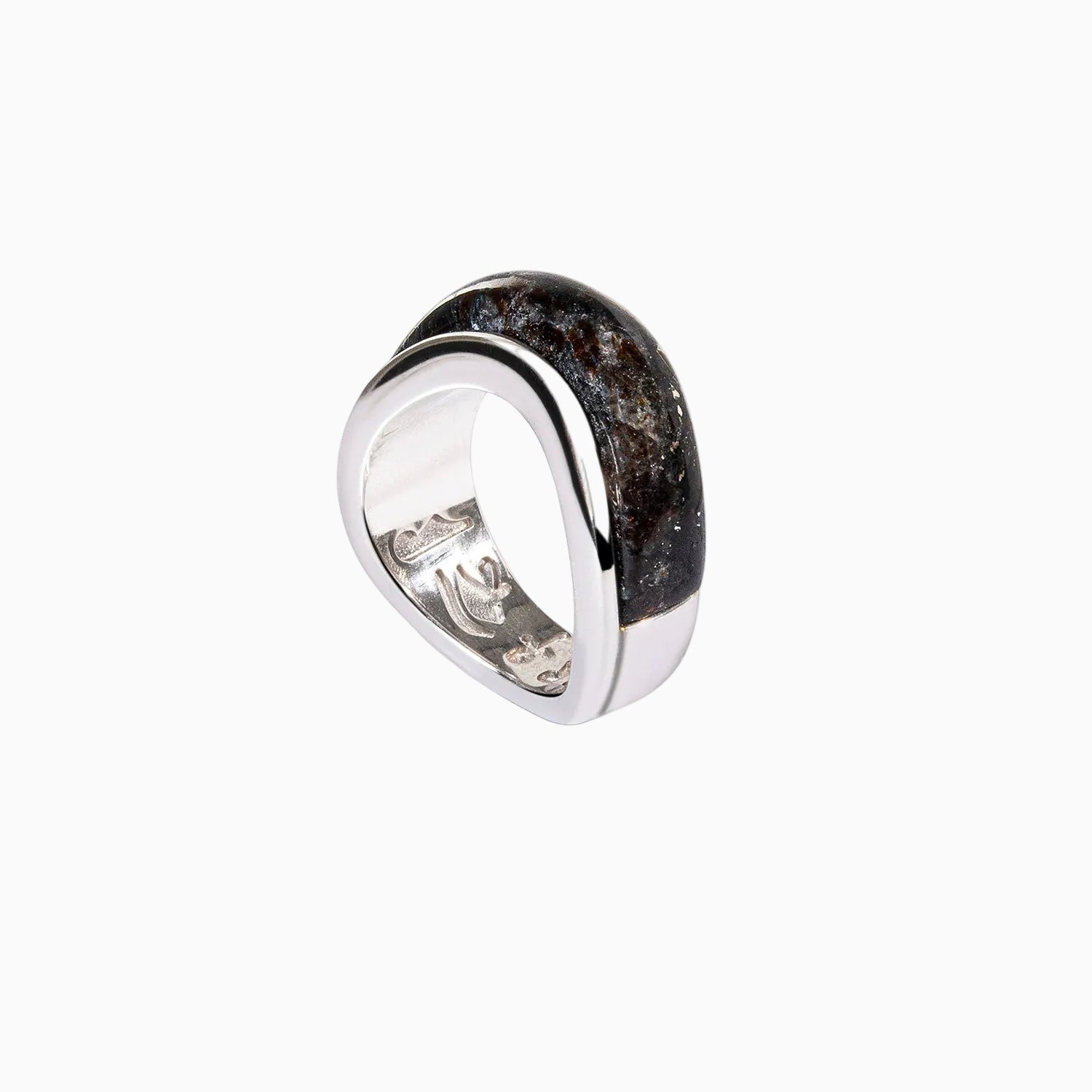 Crafted in silver with hand-carved nummite, the Arc Ring features a smooth curved silhouette inspired by the protective form of the eye. Engraved with ancient Egyptian hieroglyphs on the inside, this everyday piece offers a grounded, modern take on timeless symbolism. Designed for effortless wear, alone or stacked.