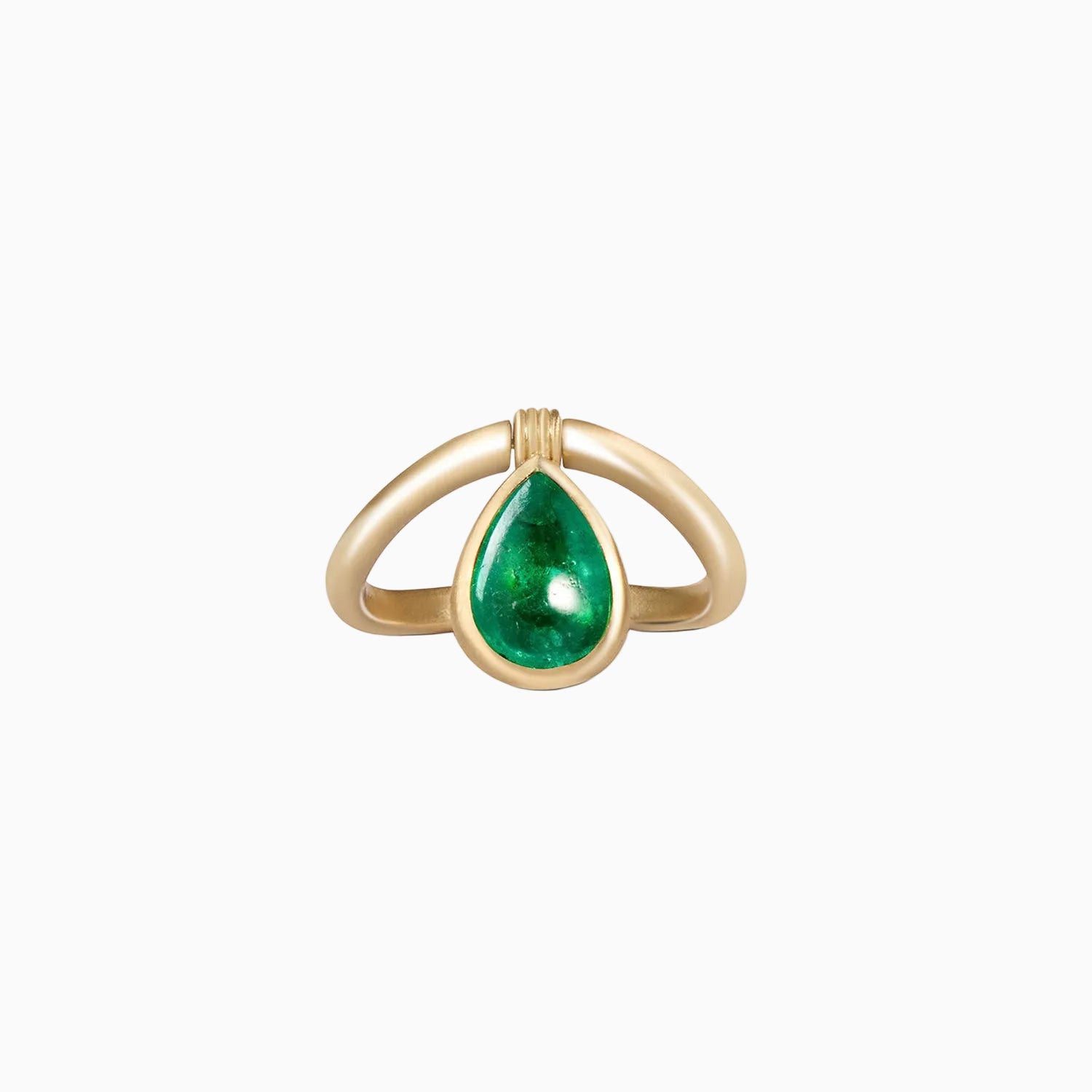 Set with hand-selected emeralds in 14K gold, the Teardrop Ring features a double-sided teardrop form that balances playfulness with quiet elegance. Symbolizing renewal and emotion, it is a refined, stackable talisman shaped in a modern silhouette.