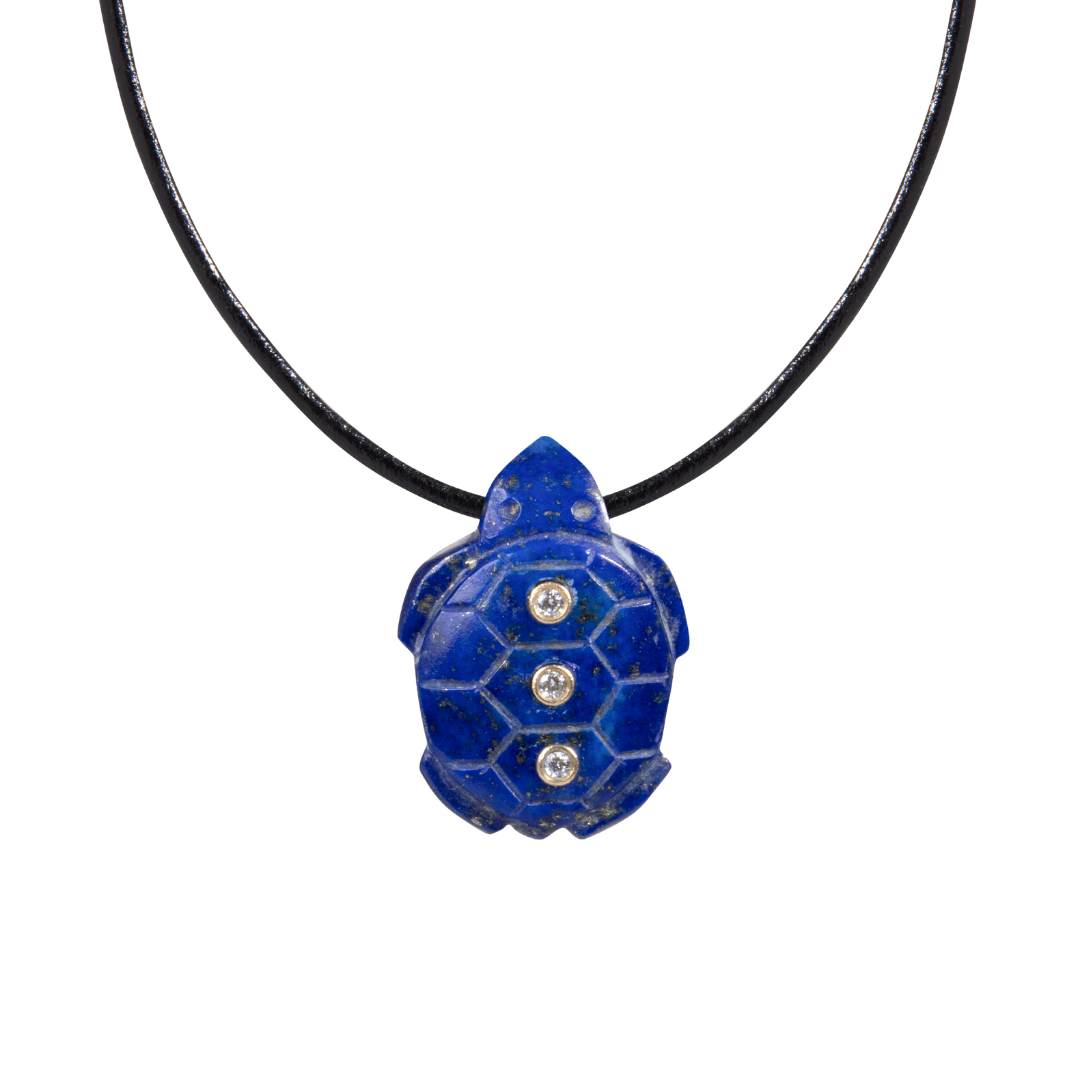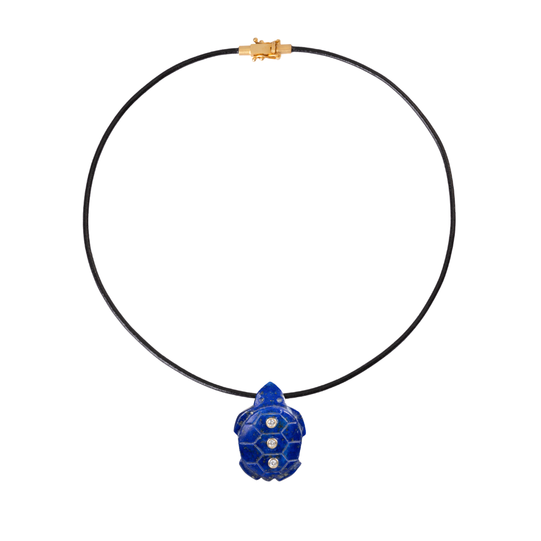 Hand-carved from lapis lazuli, this tortoise pendant is inspired by ancient Egyptian amulets, featuring diamonds set in 14K gold. Finished with black leather and our signature box clasp.